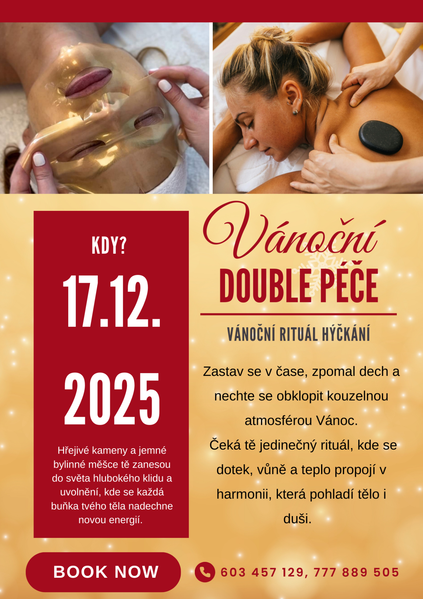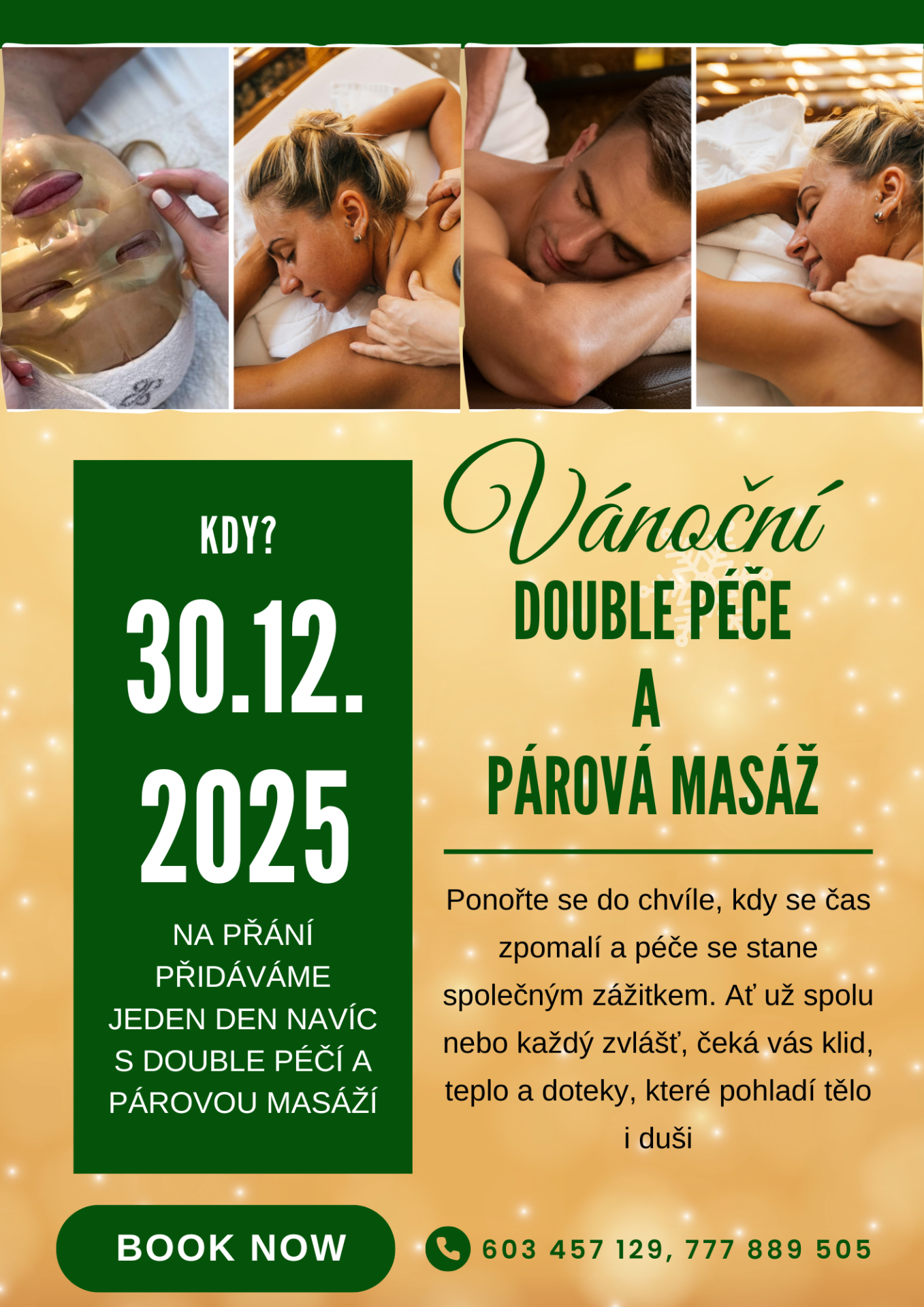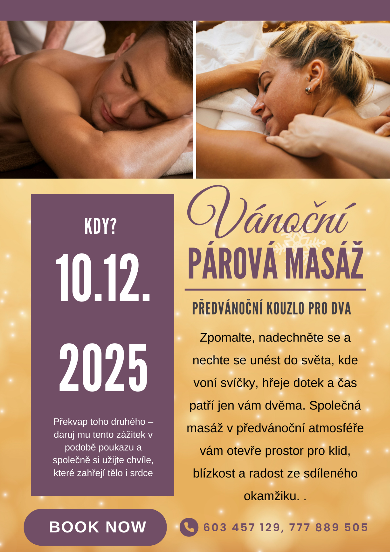 Zpomalte, nadechněte se a nechte se unést do světa, kde voní svíčky, hřeje dotek a čas patří jen vám dvěma. Společná masáž v předvánoční atmosféře vám otevře prostor pro klid, blízkost a radost ze sdíleného okamžiku.